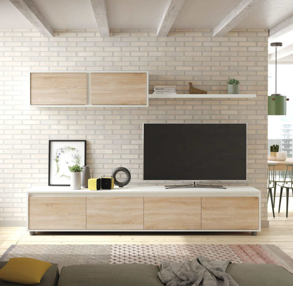 Si prefieres un ambiente más luminoso y natural, el Pack de muebles de salón Andrea nórdicos blanco y roble es una apuesta segura. Este conjunto es uno de los más vendidos gracias a su estilo nórdico, una tendencia que sigue siendo protagonista en 2026.